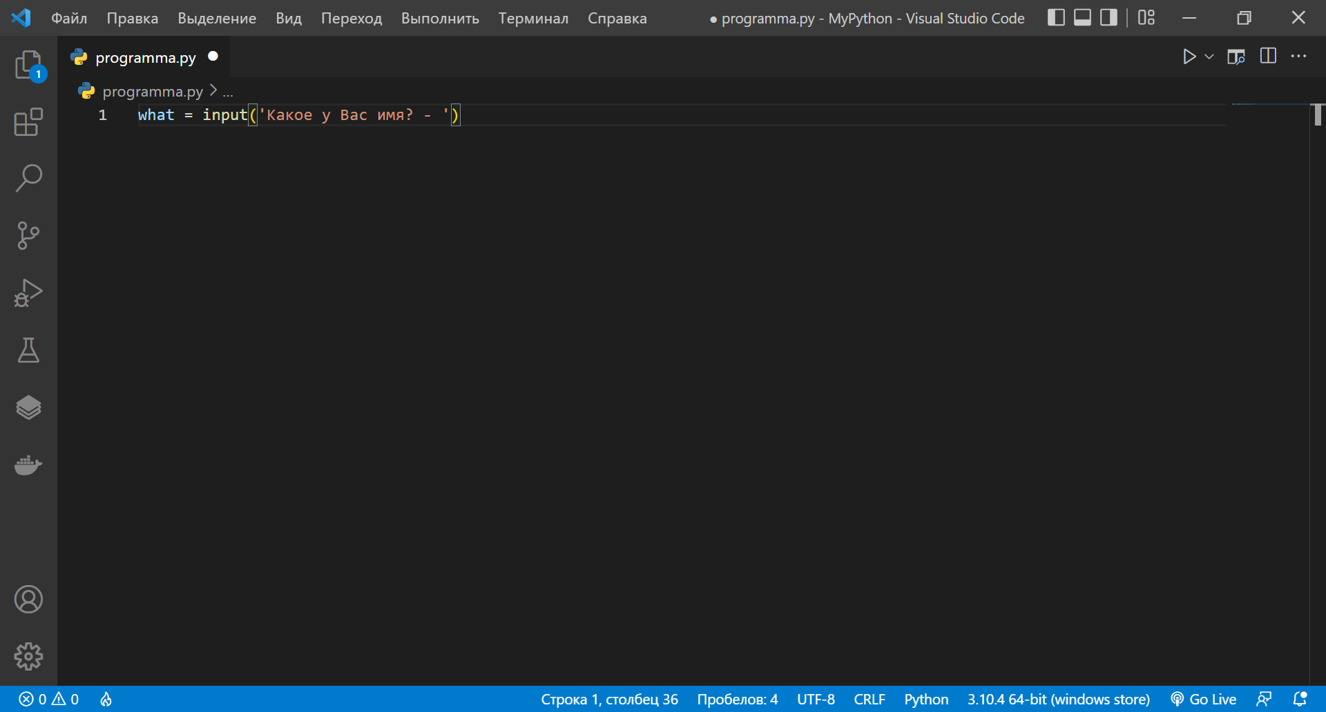 Теперь мы в программе создаём переменную, допустим мы его назовём what, и в ней мы пишем: input('Какое у Вас имя? - ')