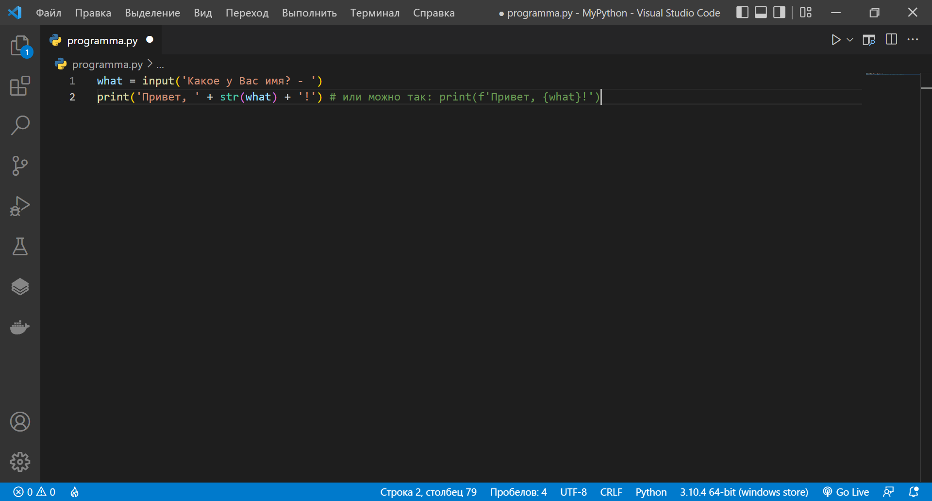 Вообще можно и проще сделать, вместо того, что мы прописали print('Привет, ' + str(what) + '!'), мы запишем вот это: print(f'Привет, {what}!') <- так