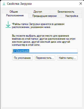 - Если у Вас мало места на диске C: и есть диск D:, у которого ещё много места, то попробуйте перенести папку "Загрузки" на второй диск.